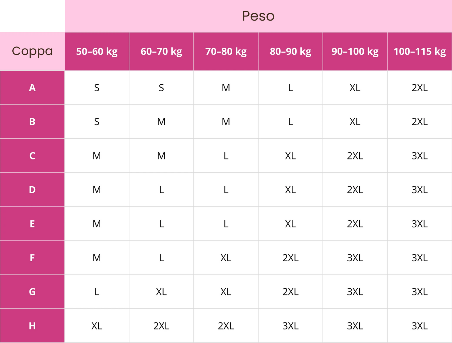 La nostra guida taglie si basa su una combinazione precisa tra coppa e peso, sviluppata proprio per il corpo delle donne dopo i 40. È un sistema molto accurato: il 95% delle nostre clienti trova la taglia perfetta al primo colpo seguendola. Inoltre Curvena ComfortLift è elastico e si adatta bene alle forme naturali del corpo, anche se il seno o il peso cambia.